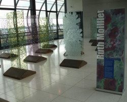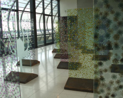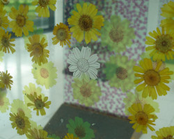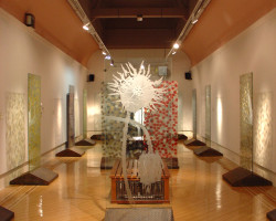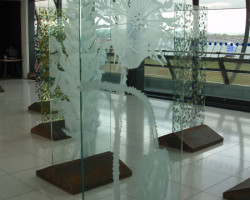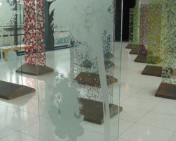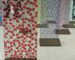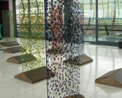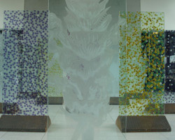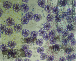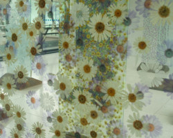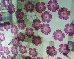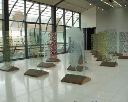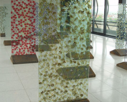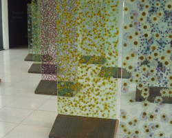 Meadowlands was a touring solo exhibition that looked at the increasing rarity of Britain’s wildflower meadow. To create this unique exhibition Ruth collected and studied the flowers and seeds of different wildflowers. These flowers formed the basis of the 18 stunning two-metre-high glass panels which made up the exhibition. The panels combine pressed flowers, photographs and etchings taken from Ruth’s studies of the plants’ intricate structures.